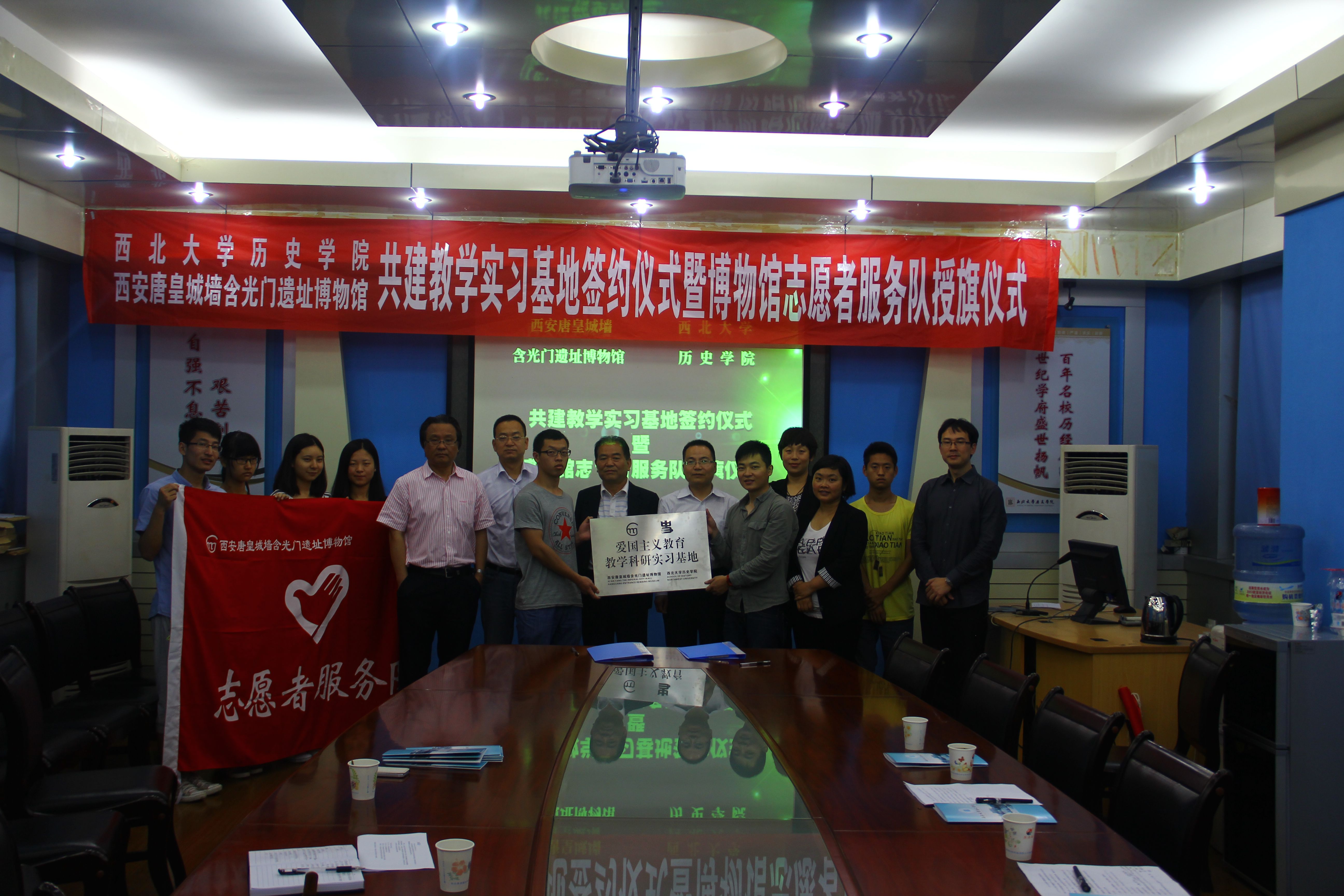 关于本次签约仪式,首先由博物馆副书记进行讲话,后由我校王新刚老师讲话,内容主要是回顾我校历史以及和含光门博物馆的友好往来,气氛十分的友好融洽。随后,是授牌仪式,接着是授旗仪式,均由志愿者代表翟佳明和陈豪同学参与。最后,全体人员合影留念。仪式圆满落幕。