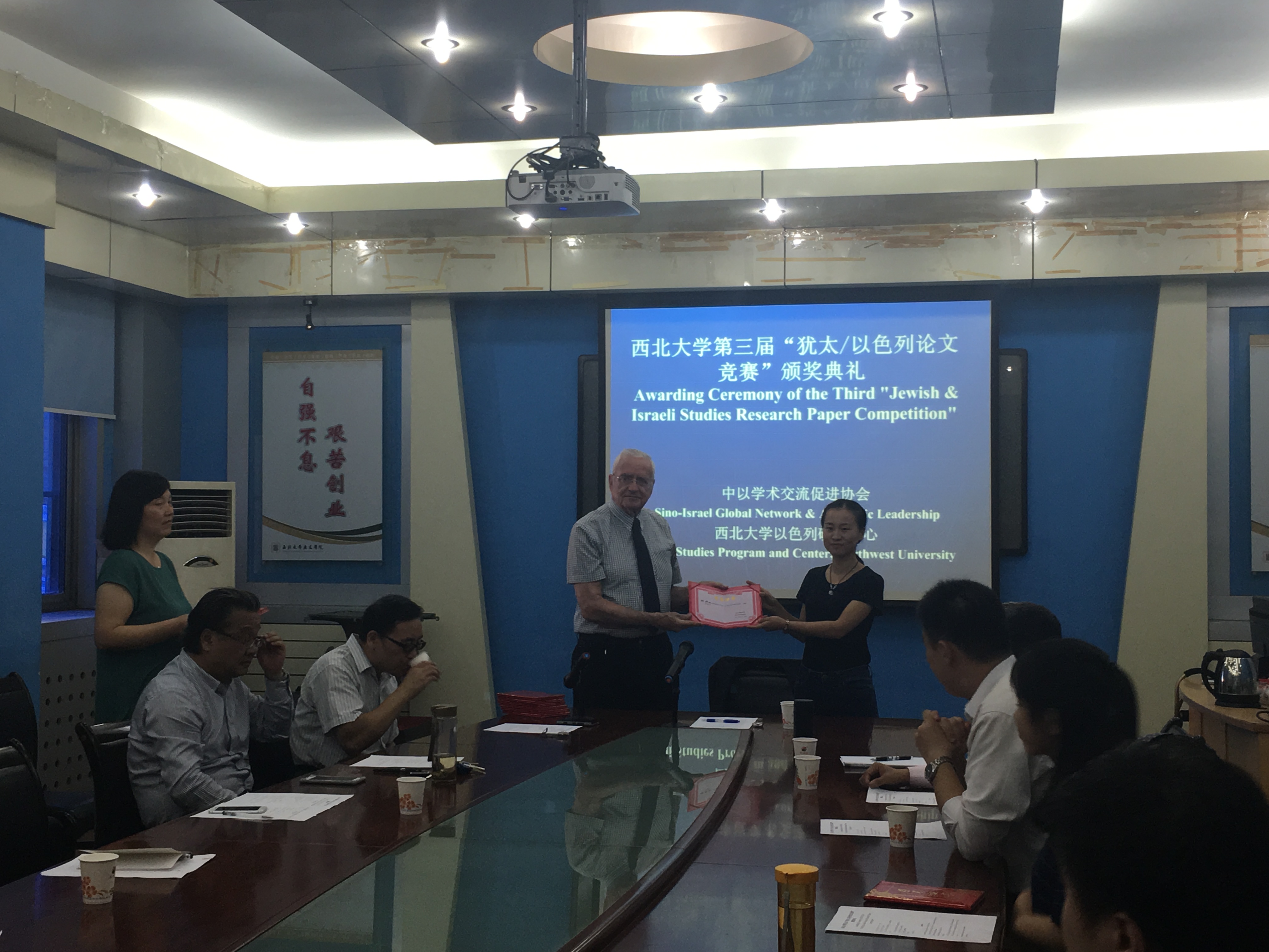 2016922,西北大学第三届犹太/以色列论文竞赛”颁奖典礼在776net必赢官网会议室隆重举行。中以学术交流促进协会(Sino-Israel Global Network & Academic Leadership)的代表以色列耶路撒冷希伯来大学东亚研究系教授麦隆·米德兹尼(Meron Medzini)为竞赛获奖的11名学生颁发奖状。西北大学以色列研究中心主任、776net必赢官网副院长王新刚教授主持典礼仪式,中东研究所所长、以色列研究中心副主任黄民兴教授和以色列研究中心副主任雷钰副教授出席典礼并发表讲话。