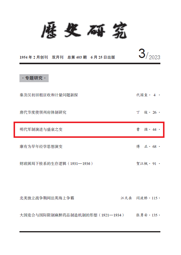 近日,我院曹循教授在《历史研究》2023年第3期发表题为《明代军制演进与盛衰之变》的学术论文,全文约3万字。
